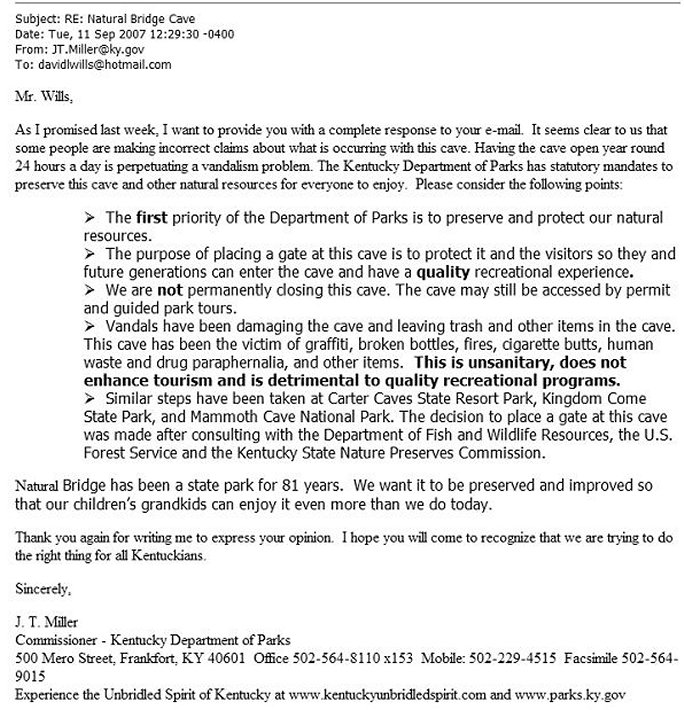 With the great need that Kentucky has for tourism, it seems irrational to bar tourists from one of the most popular places in Natural Bridge State Park. Better ways to protect the cave might have been found if the public would have been made an integral part of the decision making process - but this was not allowed. All plans were made long before the public became aware of them.